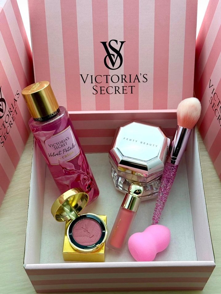 Victoria's Secret çizgili kutuda pastel pembe vücut spreyi, yumuşak makyaj fırçası, pembe makyaj süngeri, lip gloss ve allık içerir.