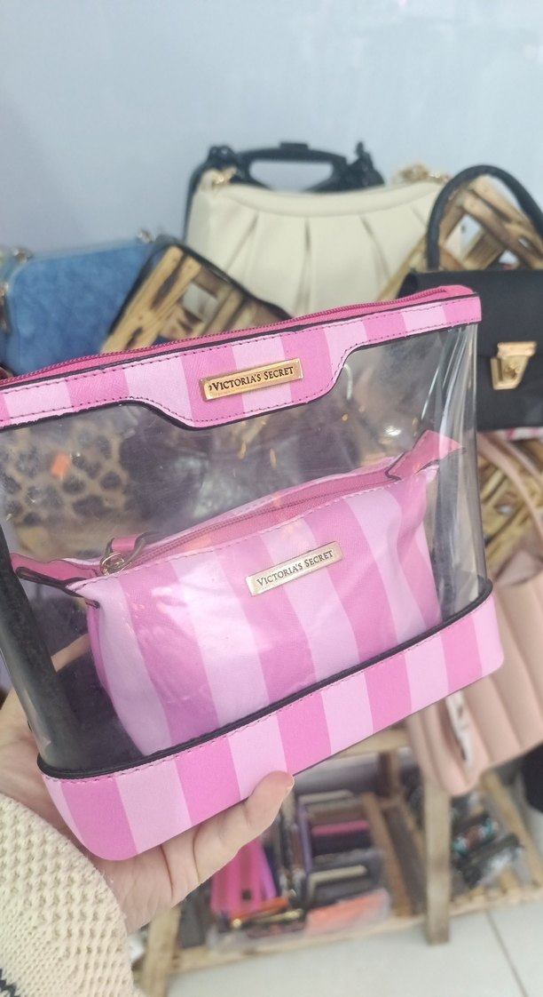 Pembe şeffaf plastikten yapılmış, fermuarlı Victoria's Secret kadın makyaj çantası. İçinde uyumlu küçük çanta bulunur, Paris tarzı ve baskılı desenli.