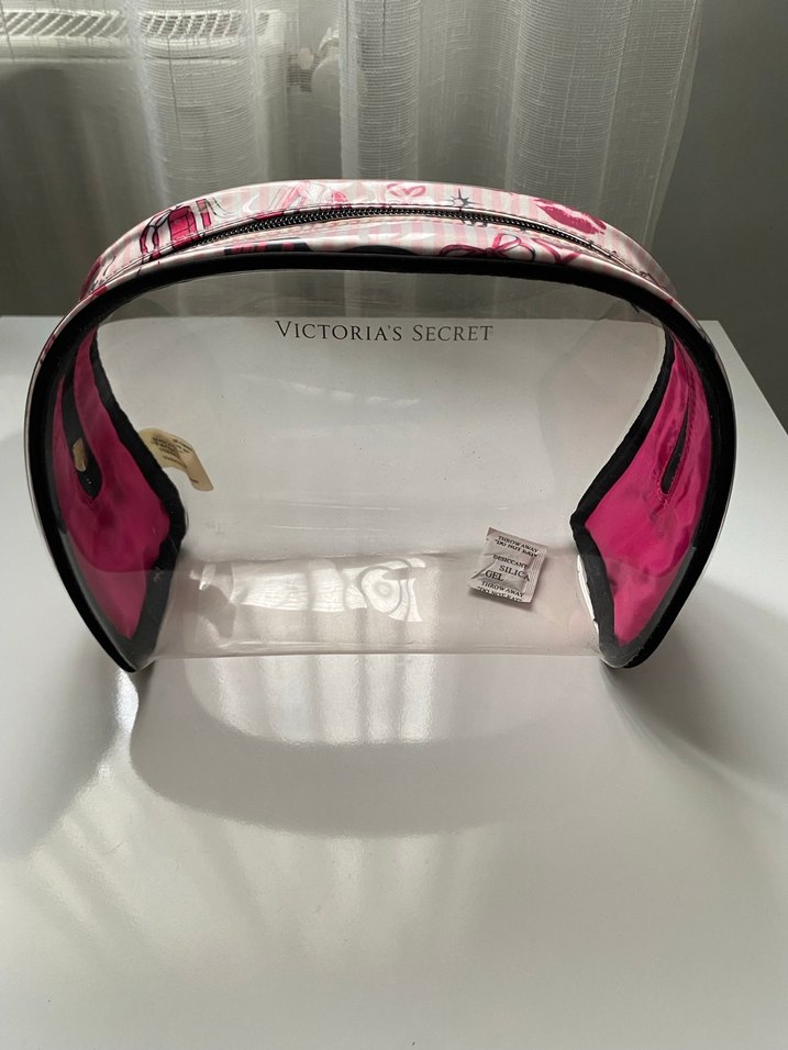 Victoria's Secret marka, pembe baskılı ve şeffaf plastikten yapılmış, fermuarlı makyaj çantası. Spor ve hareketli kullanım için uygun, vintage ve modaya uygun tarzda.