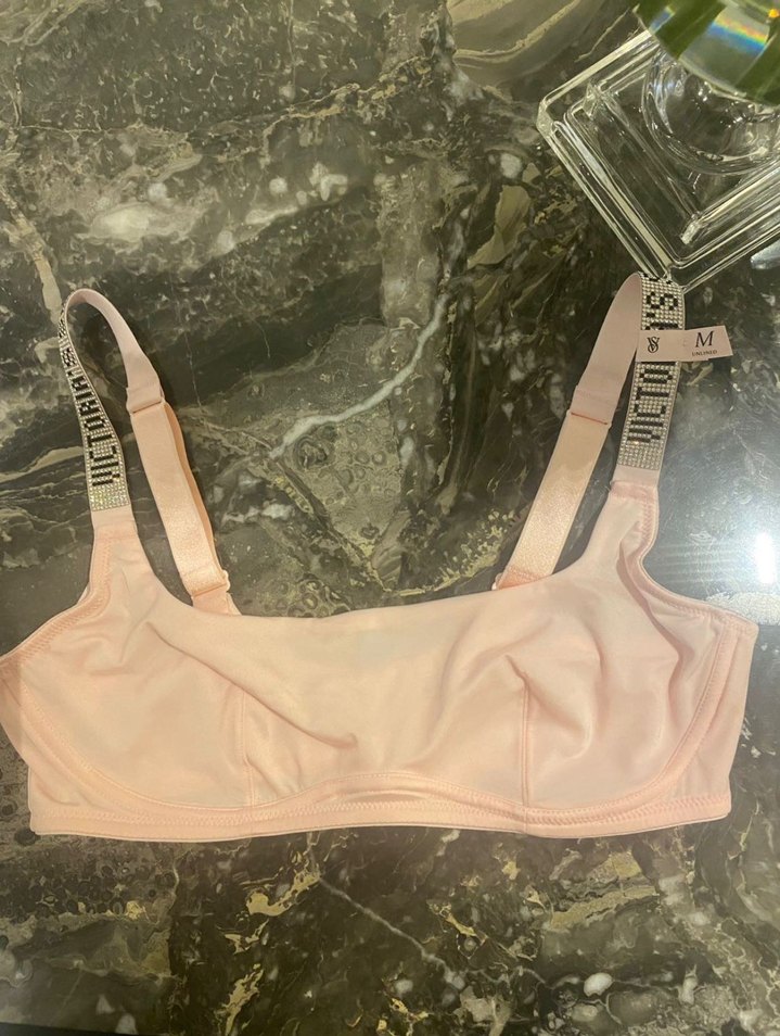 Victoria's Secret marka, ayarlanabilir askılı, logo baskılı, pastel pembe spor sütyeni. Sokak stili için uygun.