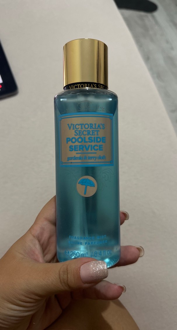 Victoria's Secret Poolside Service kadın parfümü, ferah ve meyvemsi kokusuyla 250 ml şişede, altın kapaklı mavi sıvı içerir.