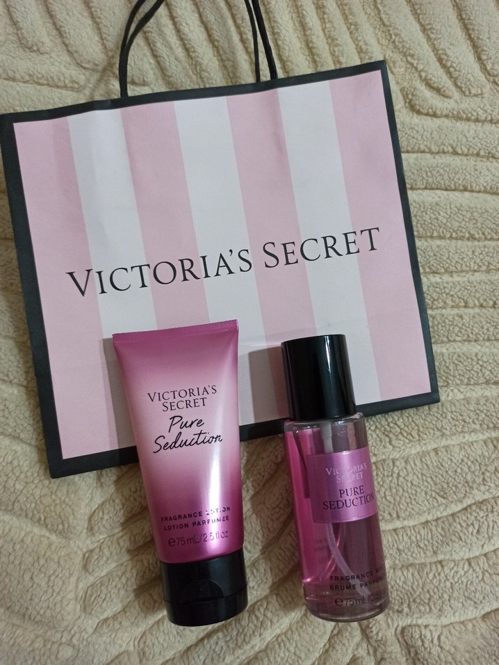 Victoria's Secret Pure Seduction kokulu losyon ve vücut spreyi seti, pembe ambalaj ve çizgili çanta ile sunulur. Ferah ve meyvemsi kokuya sahiptir.