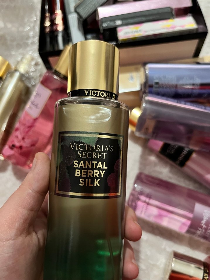 Victoria's Secret Santal Berry Silk kadın parfümü, sandal ağacı ve berry notalarıyla tasarlanmış, şık altın kapaklı şişede sunulur.