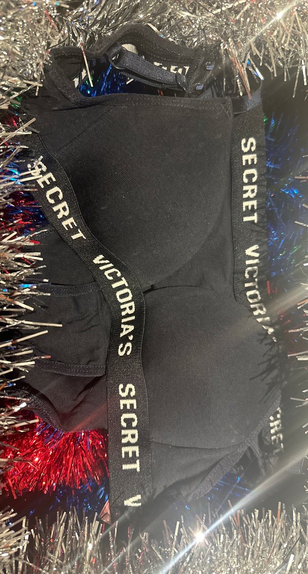 Victoria's Secret marka, baskılı bant detaylı siyah mini spor sütyeni. Kısa kesim ve athleisure tarzında sokak giyimine uygun.