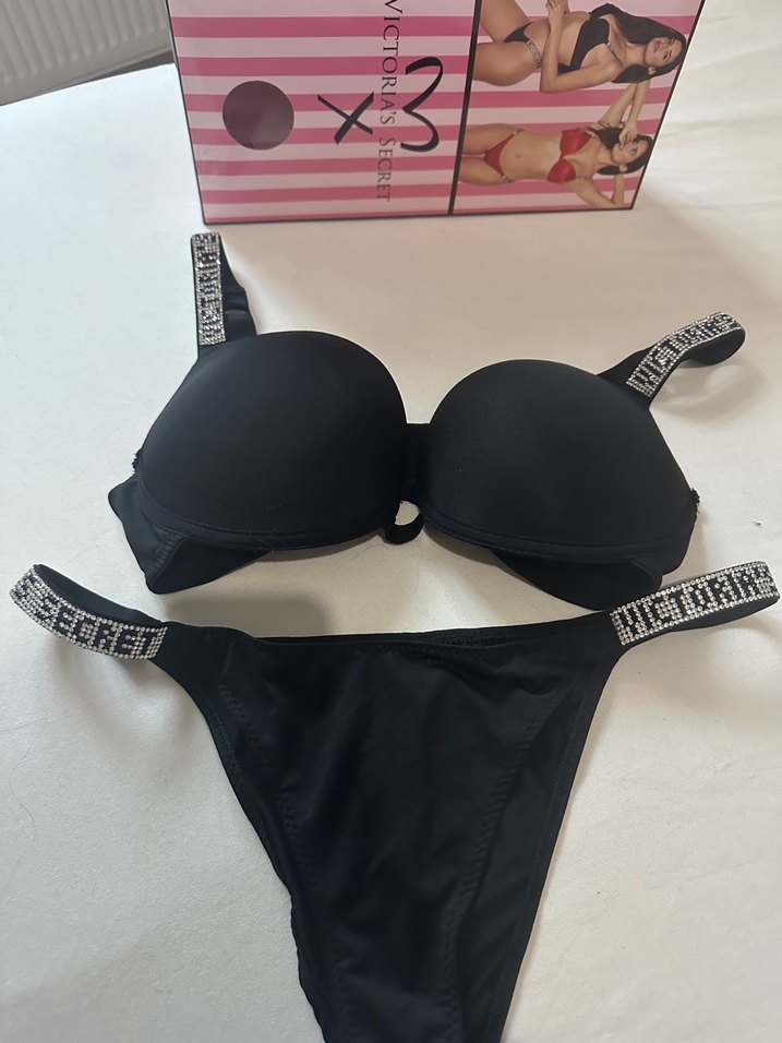 Victoria's Secret siyah sütyen ve mini külot seti, düz renk ve logolu elastik askılarla goth athleisure tarzı sunar. Çeyizlik günlük bedenler mevcuttur kutulu gönderim 90 beden