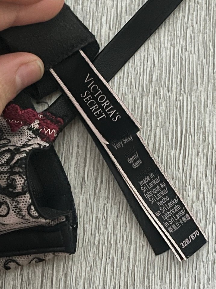 Bordo renkli, baskılı ve gotik tarzda Victoria's Secret sütyen. Normal midi uzunlukta, Sri Lanka'da üretilmiş ve 32B/70 bedenindedir.