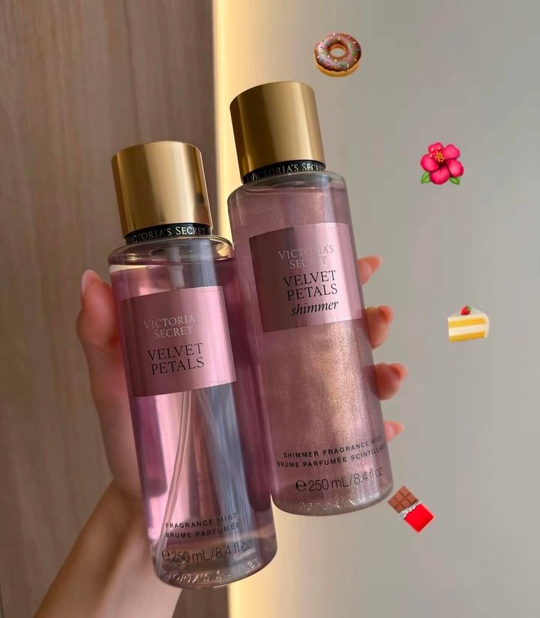 Victoria's Secret Velvet Petals shimmer parfüm spreyi, 250 ml şişede yumuşak ve zarif bir koku sunar, ışıltılı efektiyle öne çıkar.