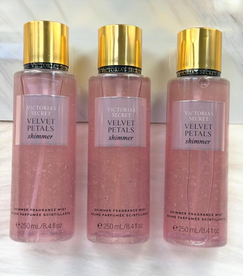 Victoria's Secret Velvet Petals shimmer parfüm mist, 250 ml şişelerde, hafif ışıltılı ve ferahlatıcı kadın kokusu.