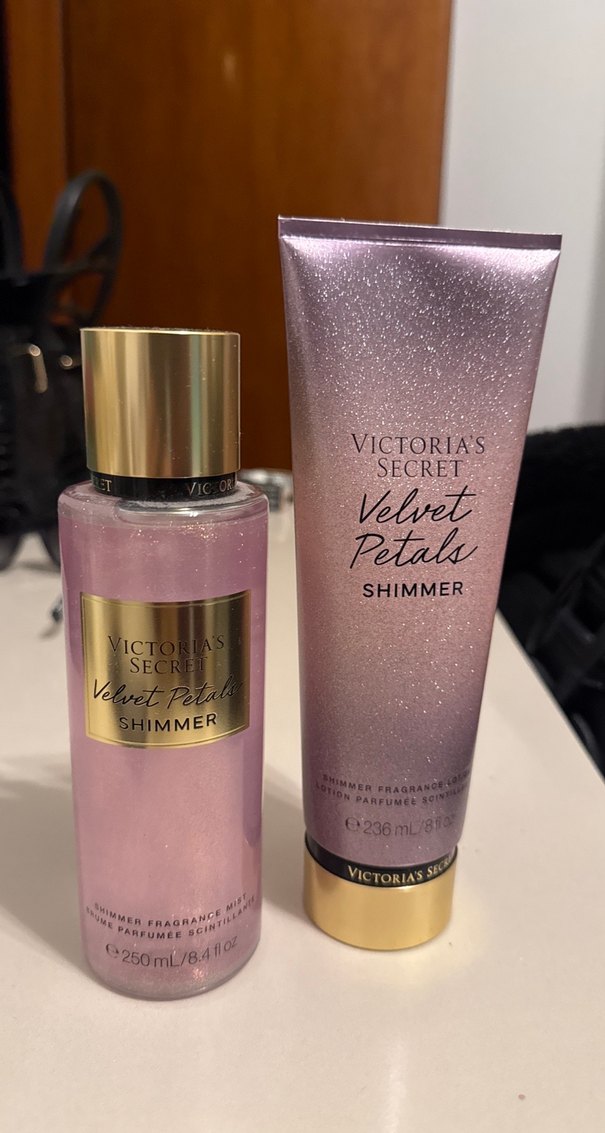 Victoria's Secret Velvet Petals Shimmer set, 250ml parfüm spreyi ve 236ml parlak losyon içerir, yumuşak pembe tonlarda ve hafif ışıltılı.