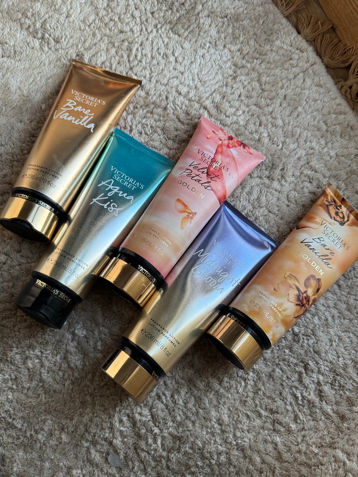 Victoria's Secret'in Bare Vanilla, Aqua Kiss, Velvet Petals, Moonlight ve Amber Vanilla kokularında renkli tüplerde vücut losyonları seti.