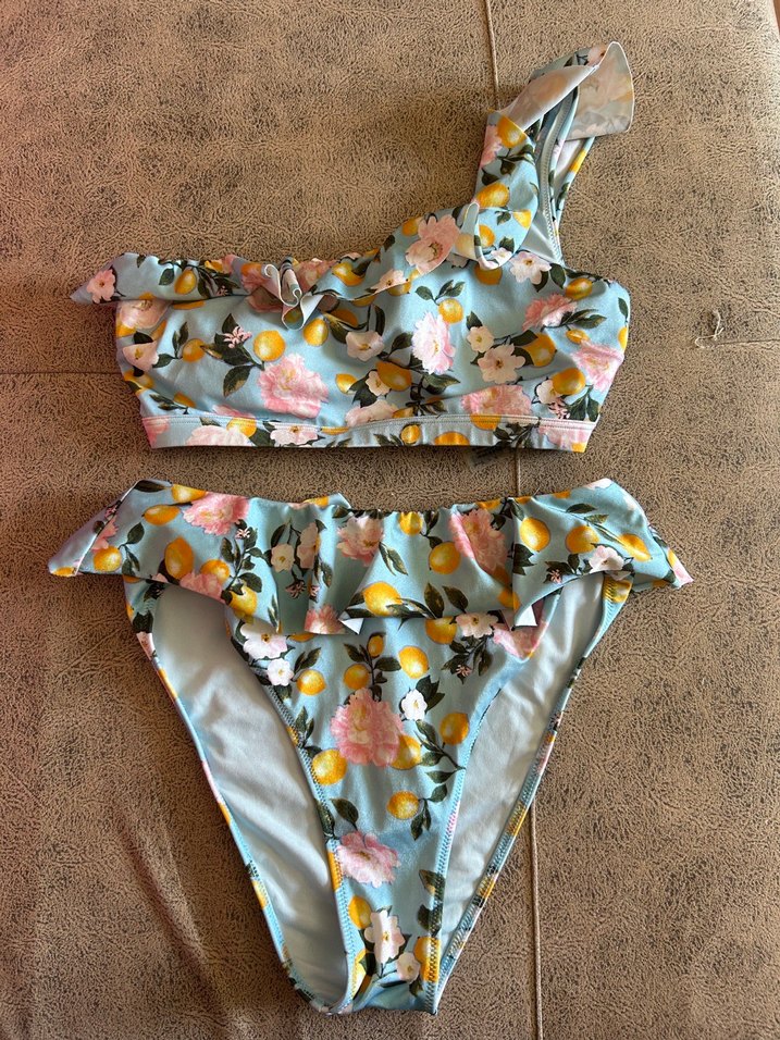 limon baskılı, askılı, pastel mavi renkli bikini, plaj için bohem tarzında.