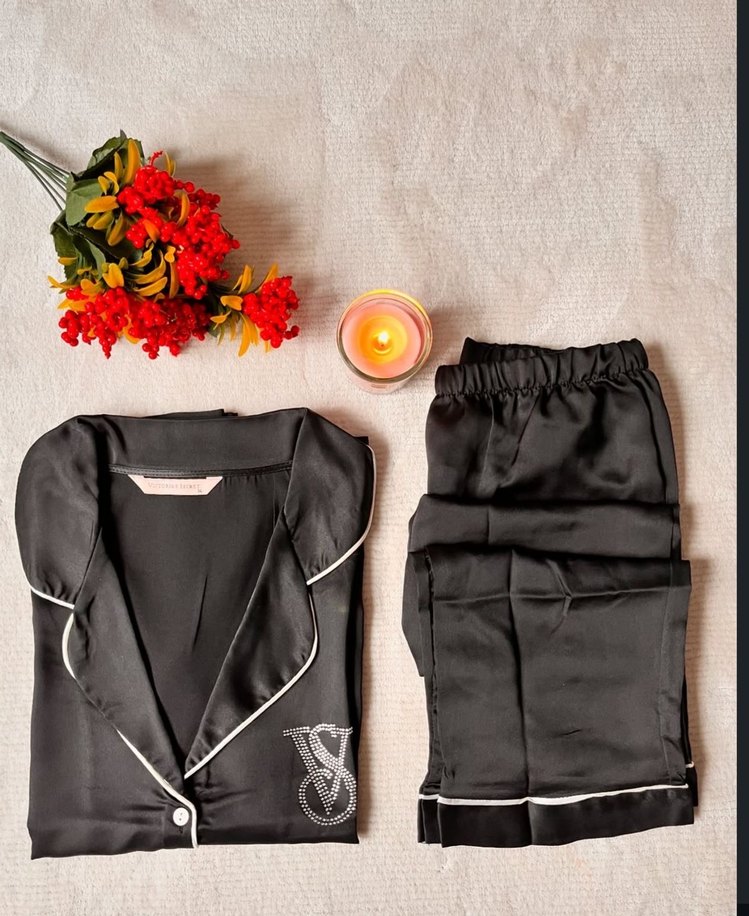 Uzun kollu, bol kesim ve parlak siyah kumaşlı kadın pijama takımı, baskılı detaylarla sokak modasına uygun rahat tasarım.