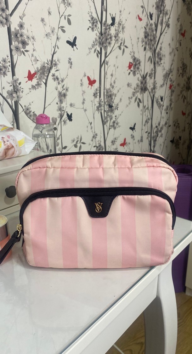 Victoria Secret Pembe Çizgili Fermuarlı Kadın Makyaj Çantası