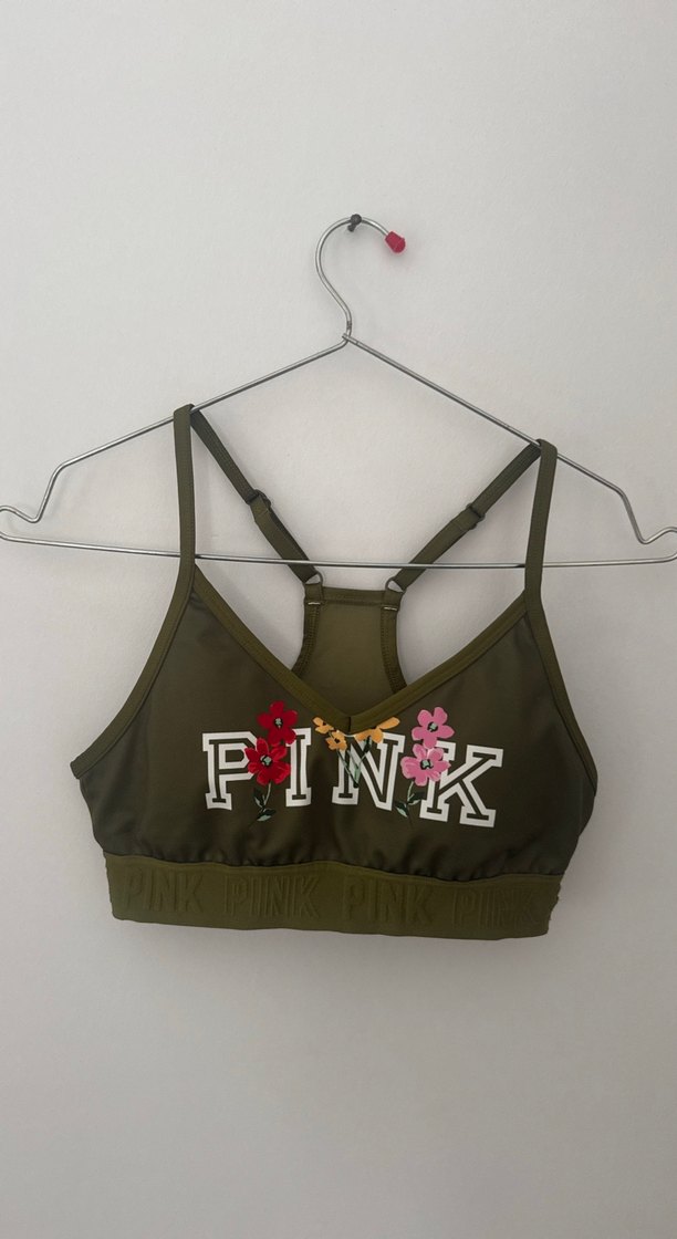 Ayarlanabilir askılı, önünde "PINK" yazısı ve çiçek desenleri bulunan koyu renk mini spor sütyeni. Sokak modası ve athleisure tarzına uygun. 2 sene önce Amerika’dan alındı. 3-4 kez giyildi. Hiçbir yerinde sorun yoktur.