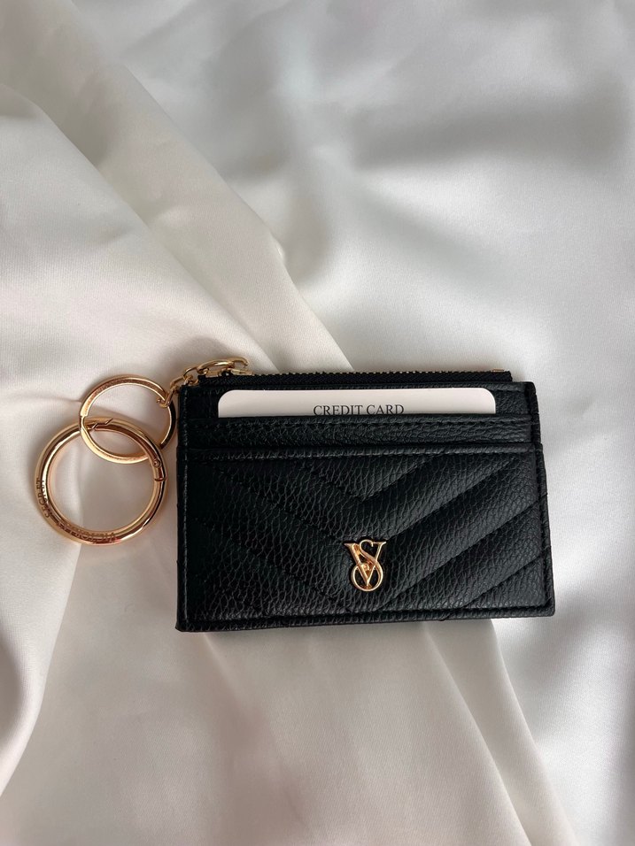 Siyah deri kadın cüzdanı, parlak altın fermuar. Kart bölmeleri ve anahtarlık içerir, günlük kullanım için klasik zarafet ve sokak stilini birleştirir.