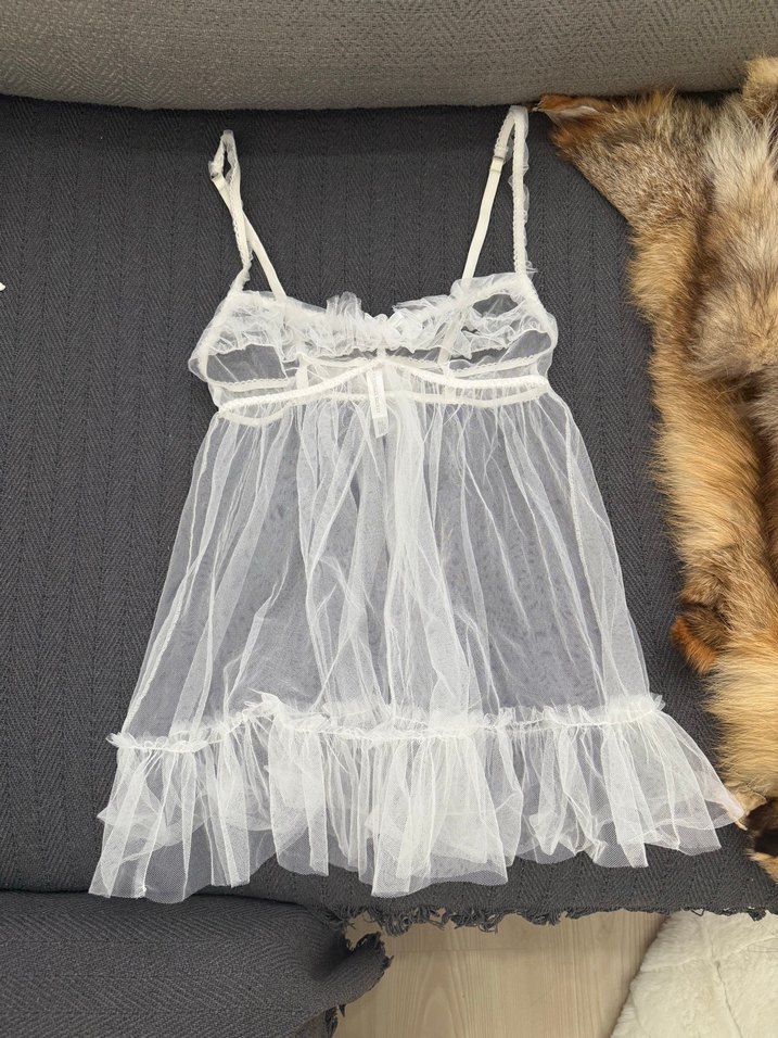 İnce askılı, beyaz ve şeffaf kumaştan yapılmış, uç kısmı fırfırlı, Paris tarzı gotik kesime sahip mini geceliktir.