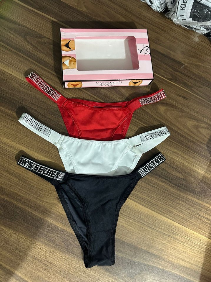 Kırmızı, beyaz ve siyah renklerde, baskılı ve markalı lastik bel bantlı üçlü mini kadın atletik külot seti. Rahat ve sportif tasarım.