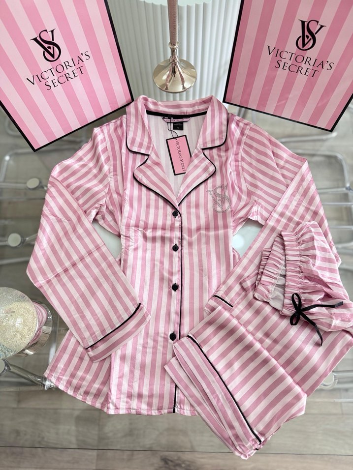 VICTORIA SECRET BASKILI PİJAMA TAKIMI. Sıfır etiketlidir. S, M, L, XL, XXL ve 3XL bedenler mevcuttur. A++ kalitedir. İpek saten kumaştır.