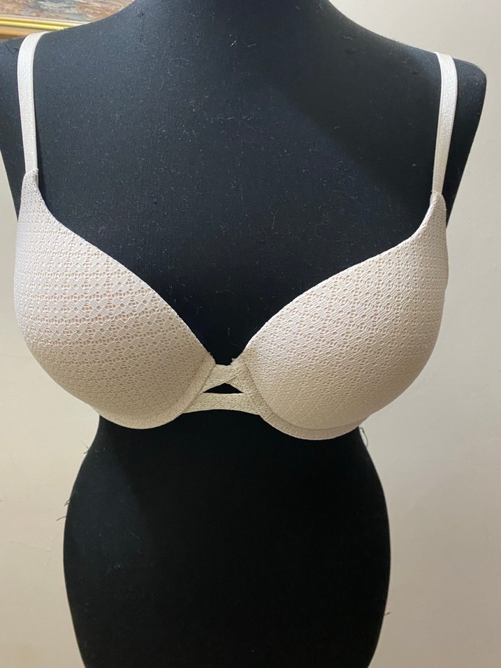 Victoria’s secret dolgulu askılı, hafif dokulu desensiz bej sütyen, minimalist ve bohem tarzda rahat kullanım sağlar. 70 D