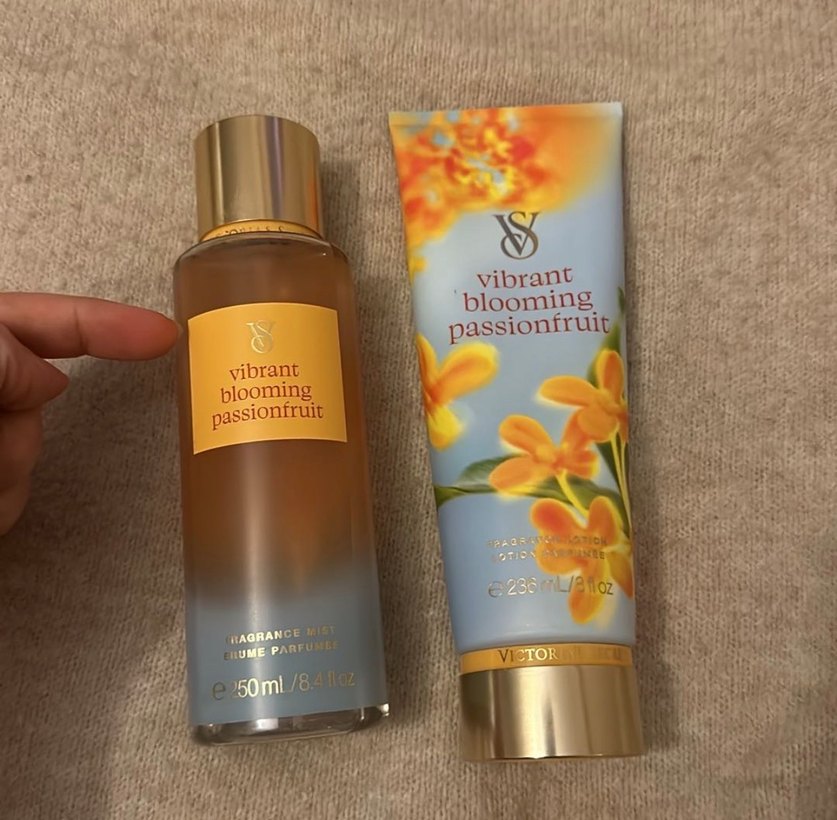 Victoria’s Secret Vibrant Blooming Passionfruit, taze ve meyvemsi kokulu kadın parfümü ve losyonu bulunmaktadır. Sprey parmaa gosterilen yere kadar doludur losyonu da %80 doludur.