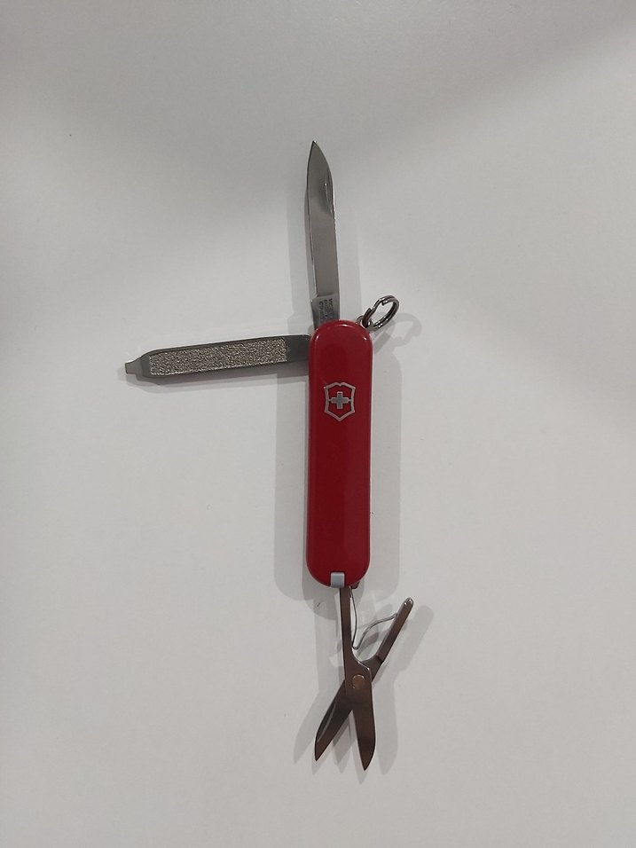 Kırmızı çok fonksiyonlu çakı, bıçak, makas ve tırnak törpüsü içerir.