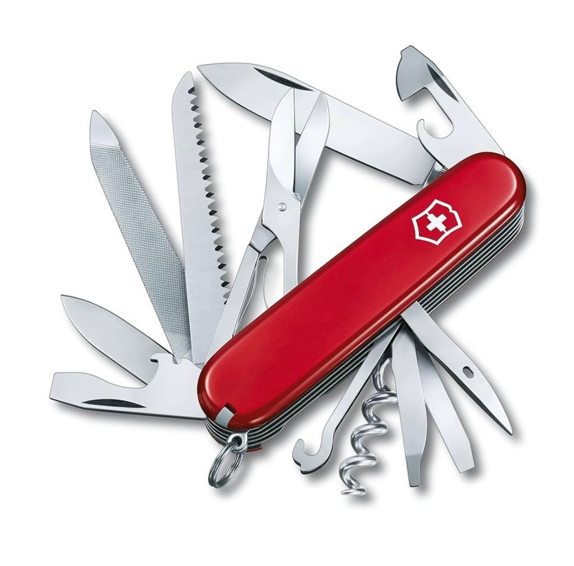 Kırmızı çok fonksiyonlu katlanabilir çakı, bıçak, makas, testere, mantar açacağı ve daha fazlasını içerir. Orijinal İsviçre çakısıdır.