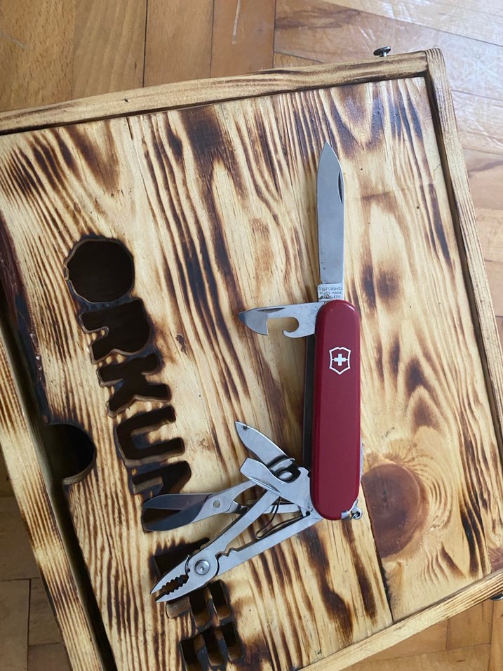 Bordo renkte çok fonksiyonlu katlanabilir çakı, bıçak, pense ve açacak gibi araçlar içerir.