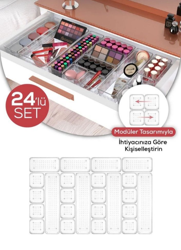 Vienev 24'lü Çekmece İçi Aksesuar Takı Ve Makyaj Düzenleyici Organizer.Küçük Kare: 16 adet 7,5x7,5x5,5 cm / Hacim: 250 ml Dar Dikdörtgen: 4 adet 30,5x7,5x5,5 cm / Hacim: 1,1 Litre Küçük Dikdörtgen: 4 adet 15x7,5x5,5 cm / Hacim: 500 ml Yüksek kaliteli şeffaf plastik malzeme 24 ayrı bölme