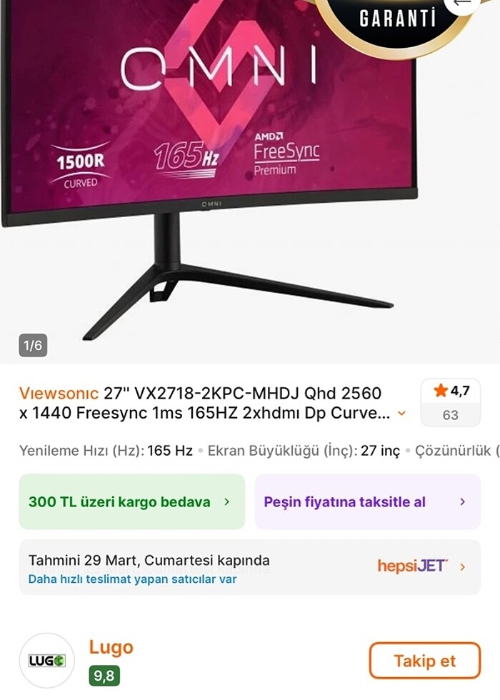 Ürün sıfırdır. Hiç kullanılmamıştır. Garantisi 2 yıl mevcuttur. Ölü piksel yoktur görüntülerde mevcut. Kendi kutusu olmadığı için diğer monitörümün kutusunda göndereceğim. Normal fiyatı 7350 TLdir.