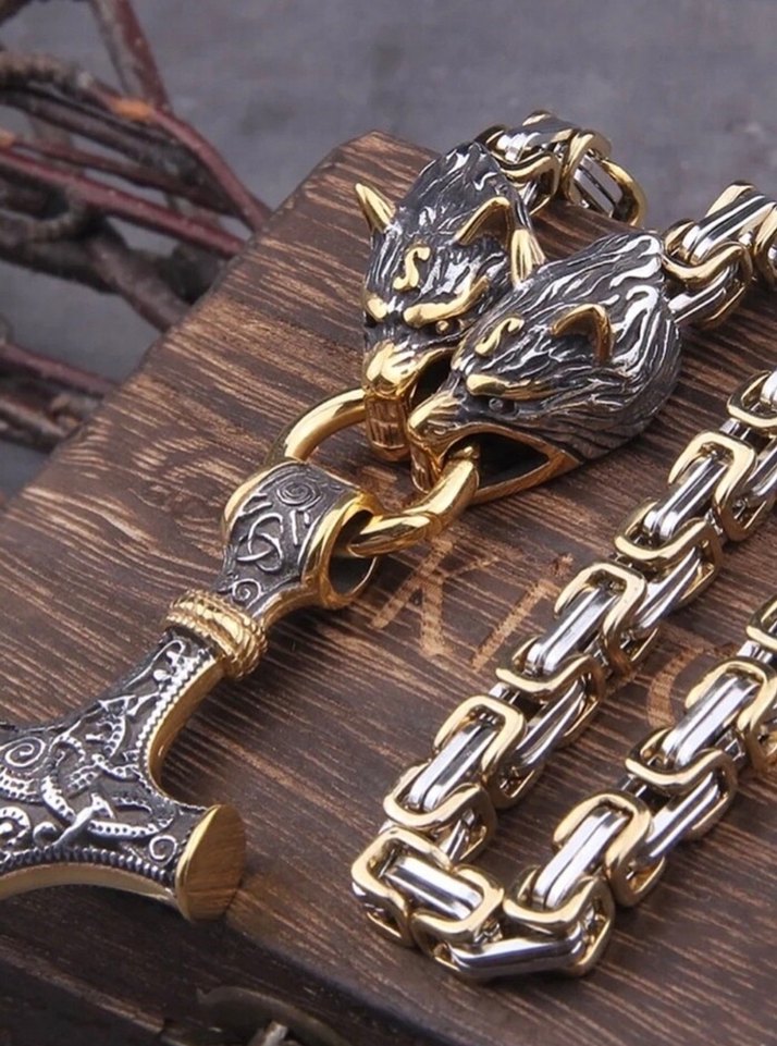 Parlak altın renkli, bohem tarzda kolye. Ayrıntılı kurt başı figürleri ve İskandinav mitolojisinden esinlenen kolye ucu ile sağlam zincir içerir. Urün sıfırdır. Ahşap kutusuyla birlikte gelecektir. Zincir uzunluğu kolye açıldığı zaman 70cm civarındadır. Yani kolye şekliyle 33-35cm civarındadır boyuna takıldığı zaman. Ağır bir kolyedir. İsveç'ten hediye geldi.