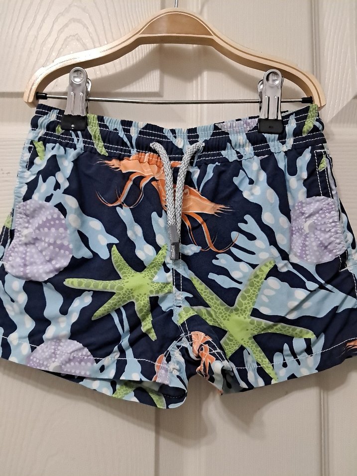 temiz ,Renkli deniz canlıları desenli, ayarlanabilir bağcıklı erkek çocuk deniz şortu. Mavi tonlarında deniz yıldızı ve kabuk figürleri içerir.