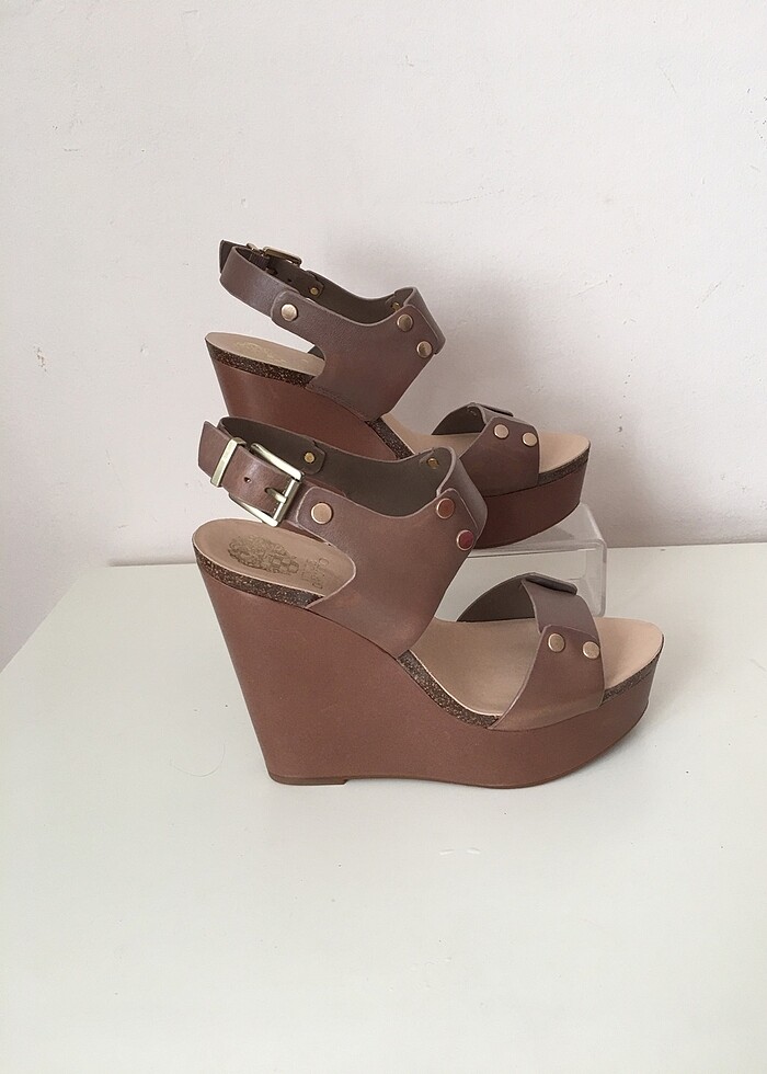 Vince Camuto 38;5 no tamamen deri vizon renk dolgu topuk hafif sandalet.Ürün sıfır ve kutuludur.Naturel deri olduğu için yan kısmında hafif dalgalanma vardır.Topuk yüksekliği:13;5cm. Dolgu taban yüksekliği:3;5cm.dir