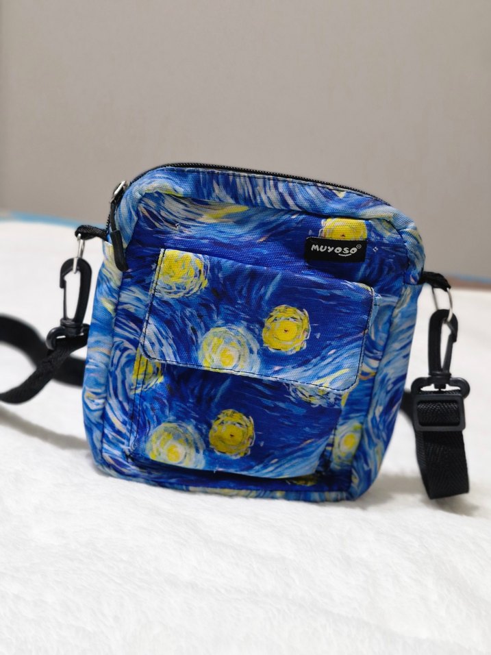 Sentetik kumaştan, renkli bağcıklı ön cepli, canlı batik desenli kadın omuz çantası, sokak stili için uygun. Bu çantadaki desen Vincent van Gogh’un “The Starry Night” adlı ünlü tablosundan esinlenmiş. Çok iyi durumda sadece 1 kez kullanılmıştır.
