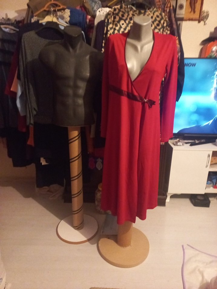 Uzun, bol kesim kadın sabahlık, uzun kollu ve derin V yakalıdır, kemer detayıyla koyu kırmızı renkte vintage bohem tarzda tasarlanmıştır.esnektir boy 113cm