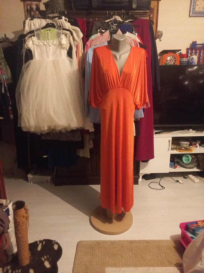 Turuncu, parlak ve ipeksi kumaştan yapılmış, V yakalı ve salaş kesimli uzun kadın elbisesi. Kolsuz ve düğünler için uygun, vintage bohem tarzını yansıtıyor. boy 133cm buzi kumaştan üretilmiştir