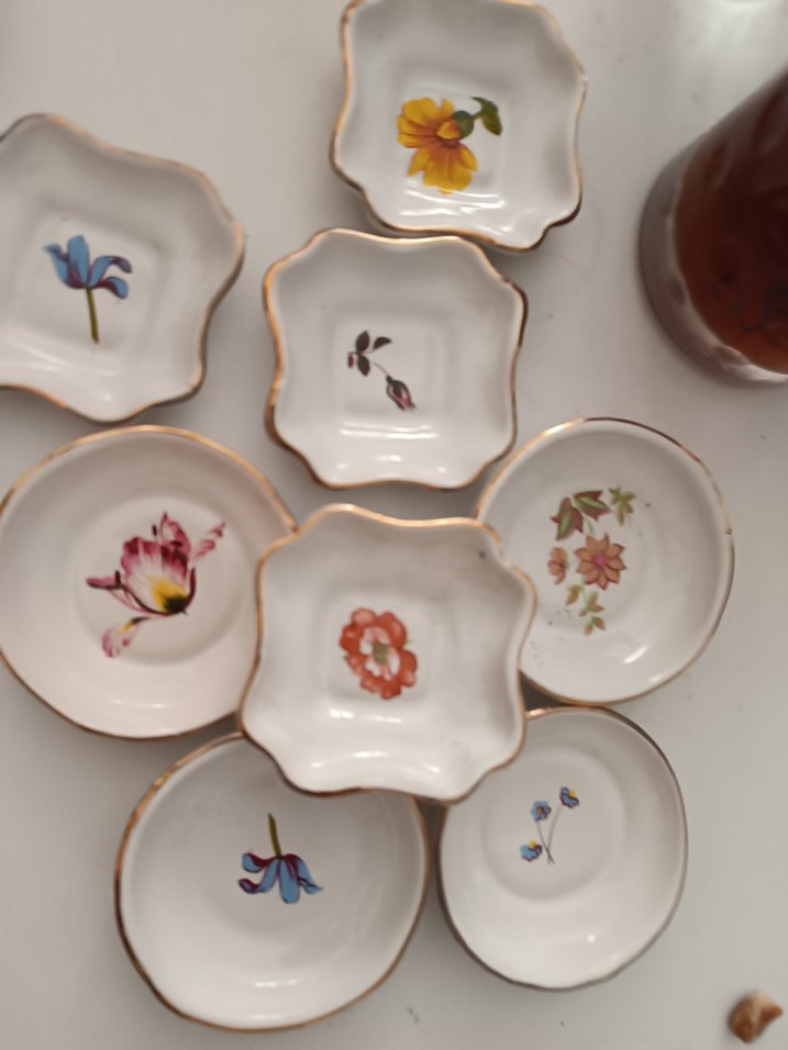 Vintage Porselen Lokumluk / Çerezlik – Altın Yaldızlı, Elde Boyama (50 Adet) 1950–1970 dönemine ait, vintage porselen lokumluk / çerezlik / nikâhlık tabaklar. • Her biri farklı çiçek desenli • Elde boyama • Kenarlar altın yaldızlı • Damgasız üretim (dönemi için normal) • Porselen hamuru beyaz ve kaliteli Ölçü: Çap yaklaşık 9–10 cm (Fotoğraflarda hurma çekirdeği ile boyut karşılaştırması vardır.) Durum: Çatlak–kırık yok. Altın yaldızlar genel olarak temiz, yaşına bağlı çok hafif kullanım izleri olabilir. Adet: Toplam 50 adet Tekli, 6’lı / 12’li set veya tamamı birlikte satılır. Fiyat ve marka temsilidir sormadan alim yapmayiniz