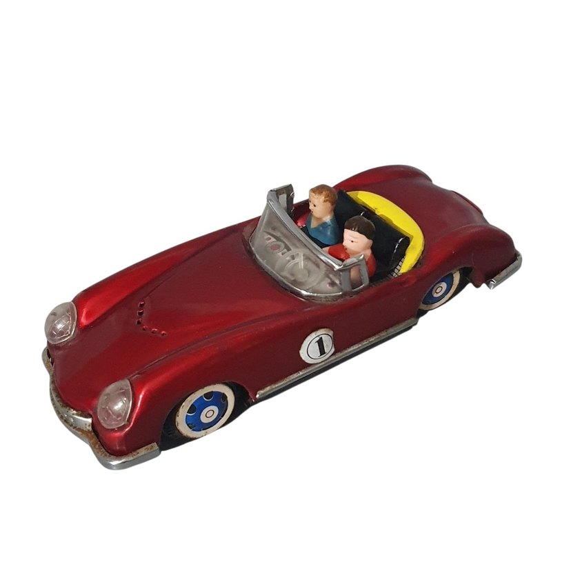 Koyu kırmızı renkte, içinde iki figür bulunan klasik tarzda oyuncak araba. ️