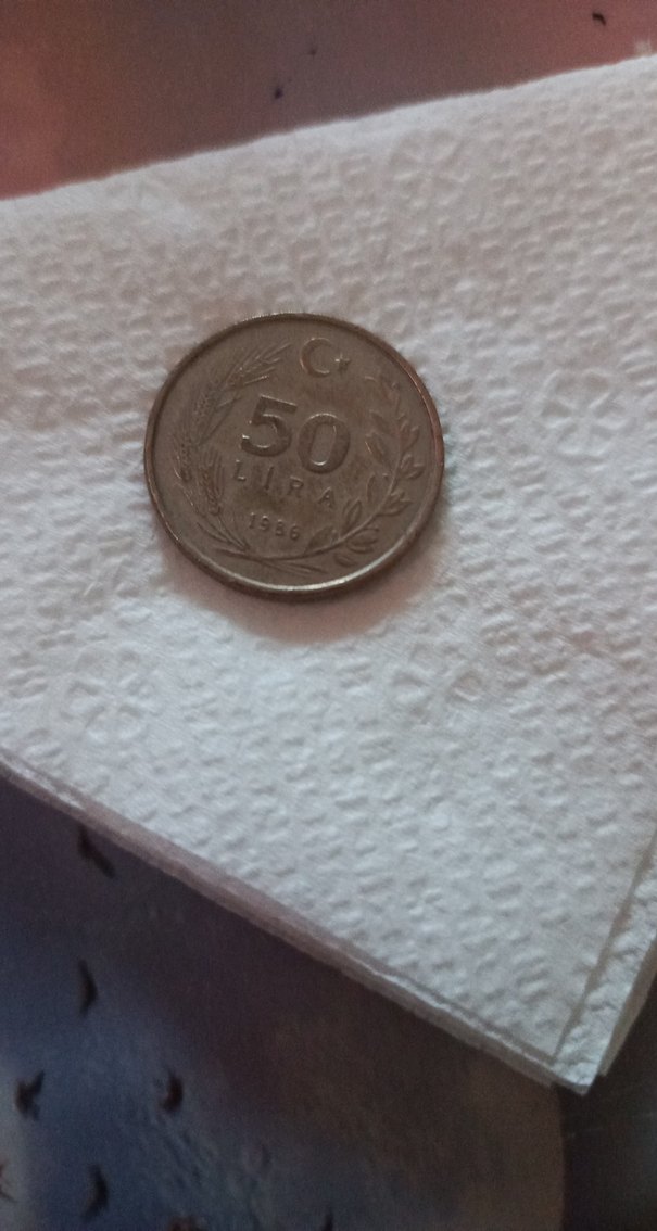 1986 yılına ait 50 Lira madeni para görünümünde, vintage tarzda erkek rozeti. Gri ve kahverengi tonlarda, sade ve klasik tasarım.