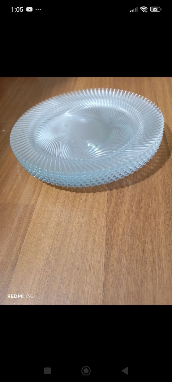 Doku kenarlı, desensiz şeffaf vintage cam tabaklar.