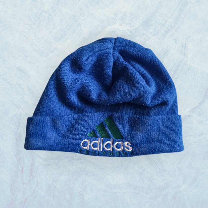 1990'lı yıllardan Adidas'ın "Equipment" serisinden mavi bere. Akrilik malzemeden ve nakışlı logo detayına sahip. Etiketinde "designed in Germany" yazıyor. Temiz ve defosuz. Ölçüler resimde verildi.