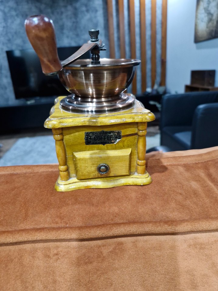 Ahşap tabanlı, oldukca eski,manuel öğütme mekanizmalı ve kahve çekirdeği için küçük çekmeceli kahve değirmeni. ☕Hem öğütme de hem de dekorasyonda ,kahve koselerinde kullanilabilir.