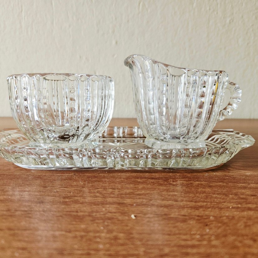 Vintage, Alman, kristal, tepsili, sütlük ve şekerlik.