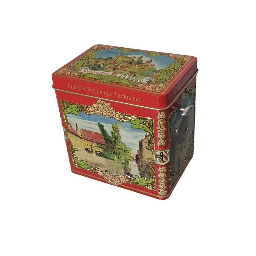 Parlak kırmızı renkte, üzerinde ELISEN Nurnberger Lebkuchen yazısı ve nostaljik çizimler bulunan teneke kutu.9×12×12 cm boyutlarında