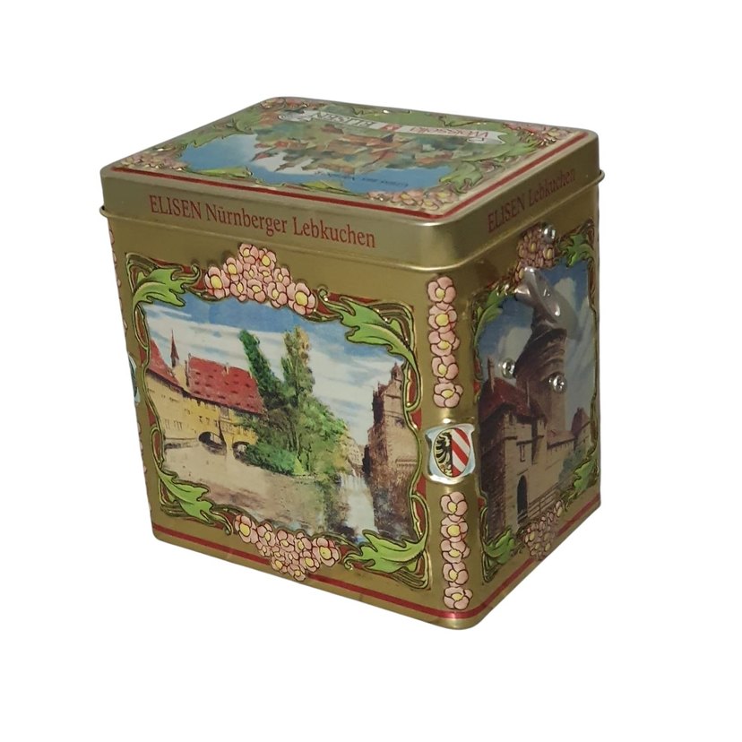 Bej parlak metal kutu, detaylı vintage tarzı illüstrasyonlar ve ELISEN Nürnberger Lebkuchen yazısı ile süslenmiş. Dekoratif ve koleksiyonluk. 9×12×12 cm boyutlarında