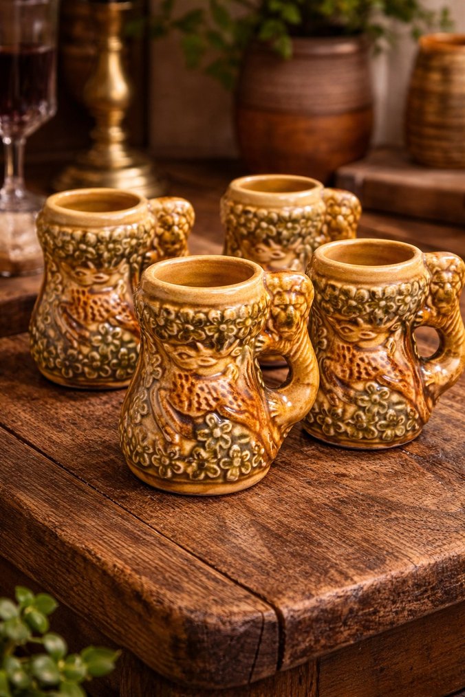 1960–70’ler Orta Avrupa üretimi, kabartmalı üzüm & yaprak desenli vintage seramik kupalar. Kalın, ağır ve kaliteli seramik yapıya sahiptir. Desenleri belirgin, dekoratif duruşu çok güçlüdür. Çatlak/kırık yoktur, çok temiz durumdadır ✨