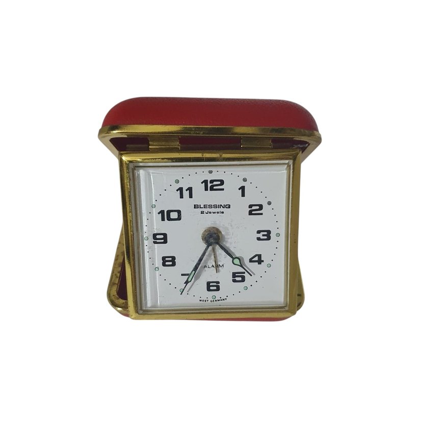 Kırmızı kapaklı, beyaz kadranlı ve siyah rakamlı kare masa saati. Alarm fonksiyonu ve renkli tasarıma sahiptir.Çalışır durumda ⏰