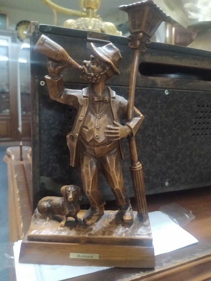 Kahverengi ahşaptan yapılmış, elinde şişe ve sokak lambası tutan adam figürü, yanında köpek figürüyle detaylı ve anlamlı bir heykelcik.