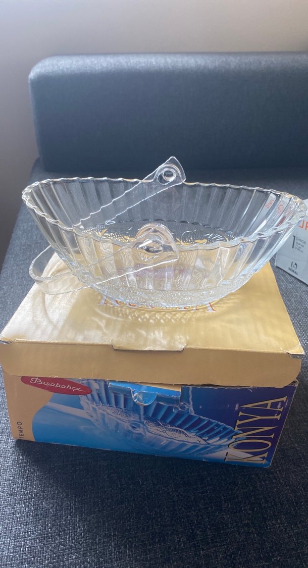 Altın desenli vintage cam salata kasesi, yanında servis kaşığı ile birlikte. Masanıza hafif ve şık bir dokunuş katıyor. Sıfır urundir