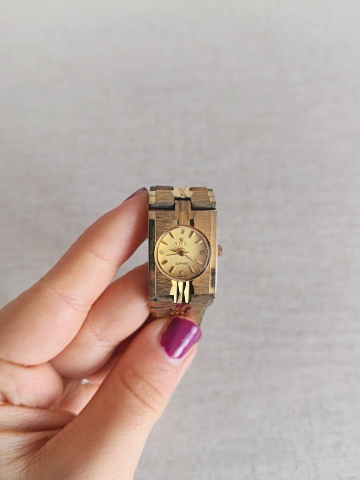 Parlak altın renkli, tokalı kayışa sahip vintage kadın saati, karşı kültür tarzını yansıtıyor. ⌚