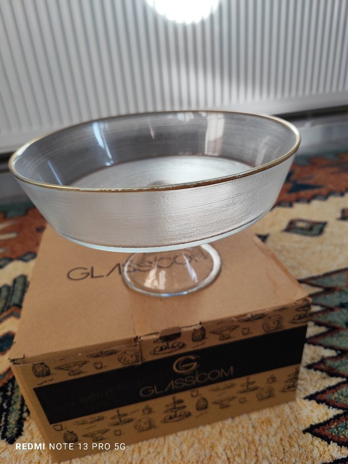 Vintage tarzda, parlak altın renkli kenarlı, şeffaf cam ayaklı kase. Sofralarınıza zarif bir dokunuş katıyor. taşınma durumum olduğu için satıyorum..